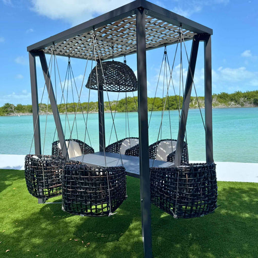 View full detailsHorizon 8FT Pergola with Lamp, Hanging Chairs & Aluminum Table